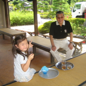 長野からはバスに乗って善光寺へ。門前町を通ってお参りして、ばあばたちは暗闇の中で鍵に触れると極楽に行けるという「御戒壇巡り」に行きましたが、真っ暗闇はハルカにはキツイだろうと、茶屋でカキ氷を食べつつ待つことにしました。この暑さにはソフトクリームよりもカキ氷だよね。