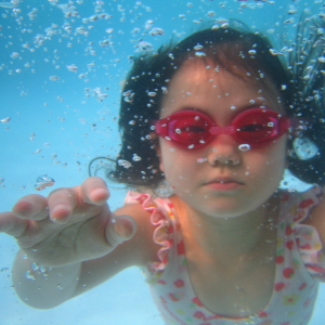スイミングで、クロールと背泳ぎ、それぞれ25メートル泳ぐ練習をしているハルカですが、ついつい途中で足をついてしまいます。