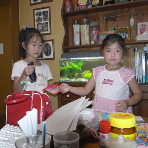 おそばで腹ごしらえしたあと、さっそく水槽の準備。水槽に入れる敷石を洗って、汲んでおいた水にカルキ抜きをプラス。このごろはカルキ抜きだけじゃなくて、水質を保つバクテリアとか、いろいろあるのね。