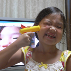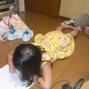 1日中なんかやっているハルカ。ぼ〜っとしていることはまずありません。しゃべっているか、絵を描いているかというくらい、絵を描くのが大好き。自分で、しゃあしゃあと、「絵は得意だも〜ん」なんていうんです。
