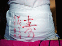 先生が巻いてくれた腹帯。デカイ「寿」の文字がすごい。(笑)