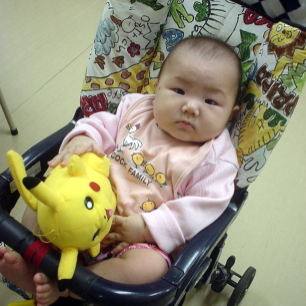 この天気のせいかわりと空いていたんだけど、やっぱりぱるぱるは飽きちゃう。待合室の「ぴかちゅう」で、しばらく遊んでくれたけど、それも10分が限度。しょうがない、こんなところで申し訳ないが、お腹も少々減っているだろうからと「赤ちゃんせんべい」を差し出すと、ケダモノのようにかぶりつくぱるぱる。