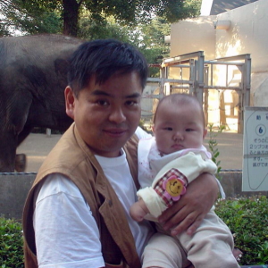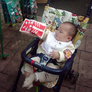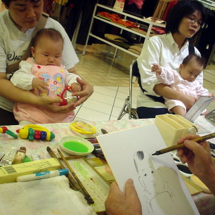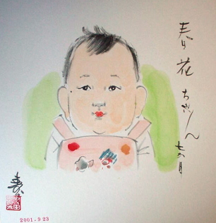 高島屋につくなり、速攻で赤ちゃん休憩室へ。スッキリしたところで描いてもらいに行ったのですが、描いてくれるのが「日本漫画研究会」というところのおじいちゃんで、俳画を思わせる日本絵の具のセット。そして後ろに貼ってある見本がどれも暗い。・・・失敗したかもぉ〜。やっぱコレが¥1000の世界? でも今更、いいですとも言えず、ぱるぱるを抱っこして10分。出来あがったのがコレです。コケシのようですぅ〜。もうちょっと、ぱるぱるはかわいいです・・・。