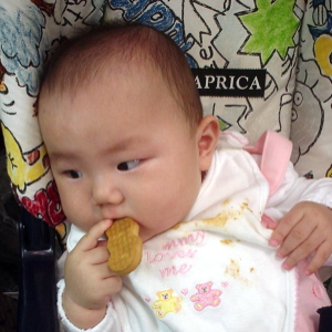 そして、スタイを交換して、気を取り直して、「青海苔せんべい」を食べさせてみると、これもお気に入りの様子。よかったよかった。
