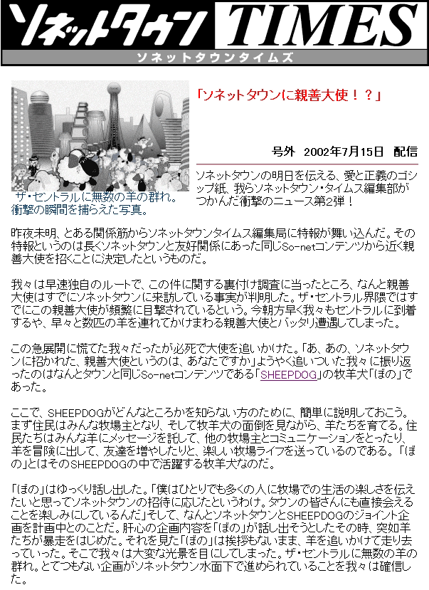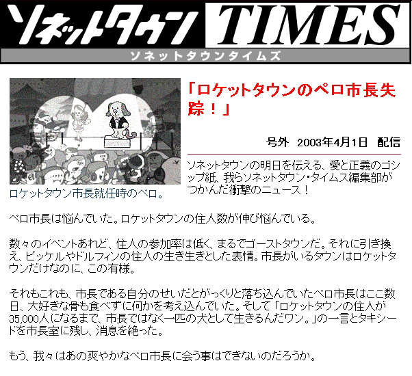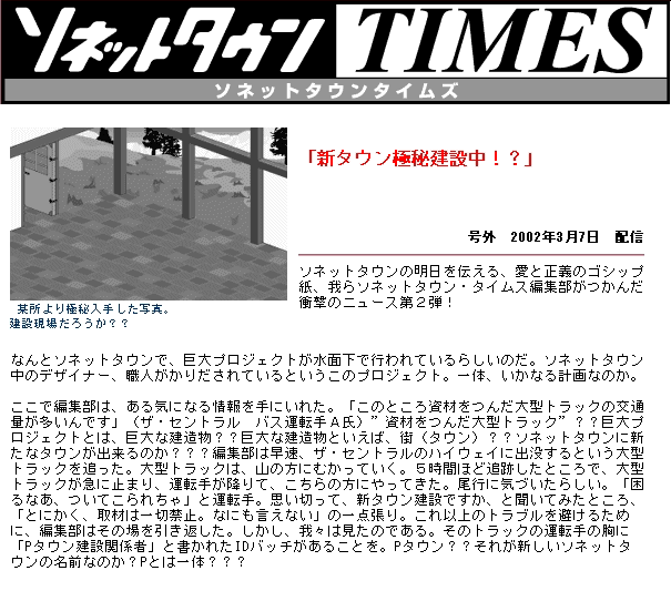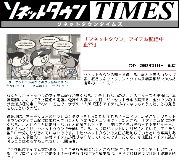 ソネットタウンTIMESは、不定期に配信されるソネットタウンの号外新聞です。 いつも住人をドキッとさせるショッキングな「見出し」が踊っていました。 |