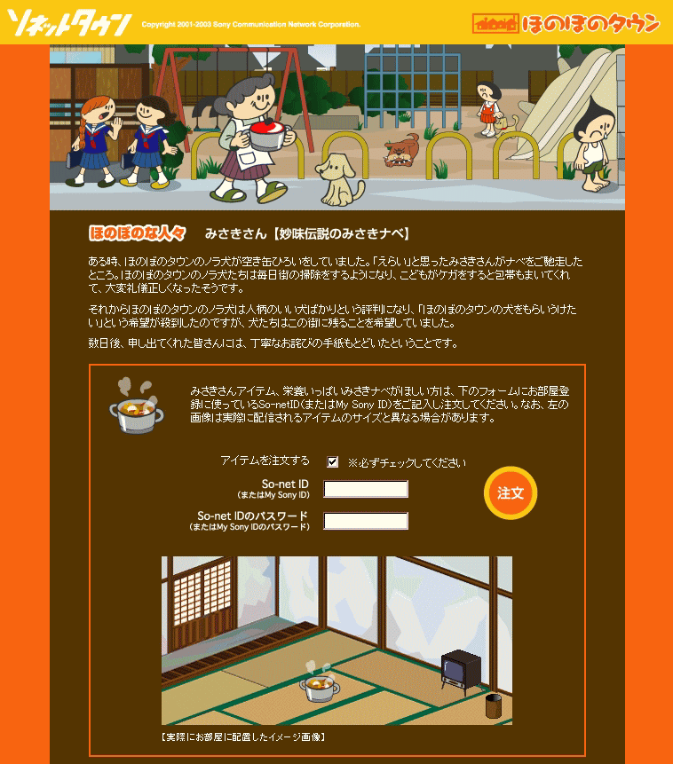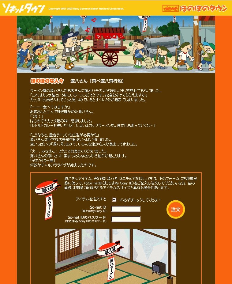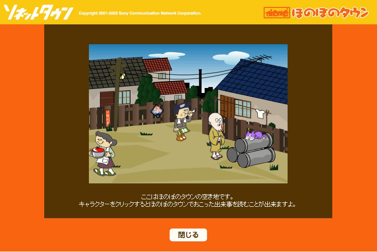 ヒロさんのハイパー紙芝居「ソネットタウンの四兄弟」 ほのぼのタウンの紙芝居屋のヒロさんが、不思議な長編紙芝居を披露しました。 毎回、話の後のナビゲートで部屋をのぞくと、その部屋がお話の舞台になっていました。お話に沿って秘密の企画も予定されていました。 2003年ソネットタウン四兄弟のアイテムショップ [2003.05.23~2003.05.26] 父親の遺言により、自分の好きな街でそれぞれ商売をはじめることになった四兄弟のアイテムショップです。 [2003.06.30] 2003年6月11~23日に出題されたパズルを解いた先着各20人にアイテムが配布になりました。 【スペシャルチャンス!】 ※ 先着1位は、ご希望アイテムとサブリナカップアイテムの両方がプレゼントされました。 |