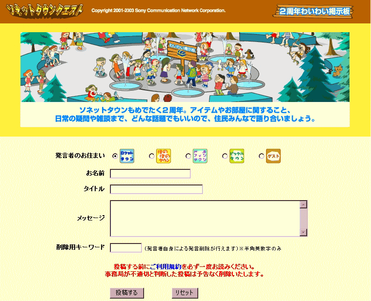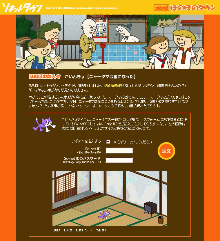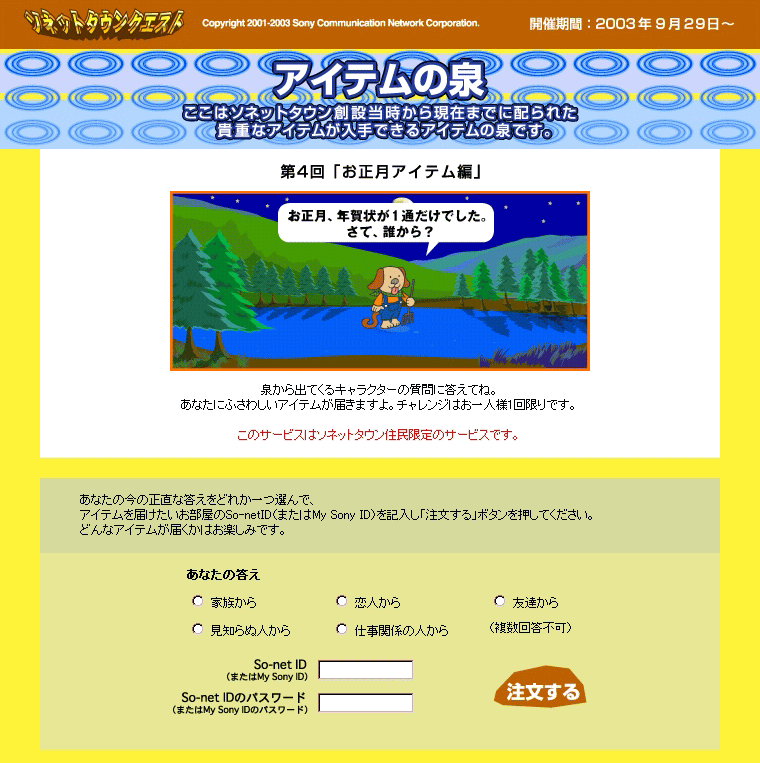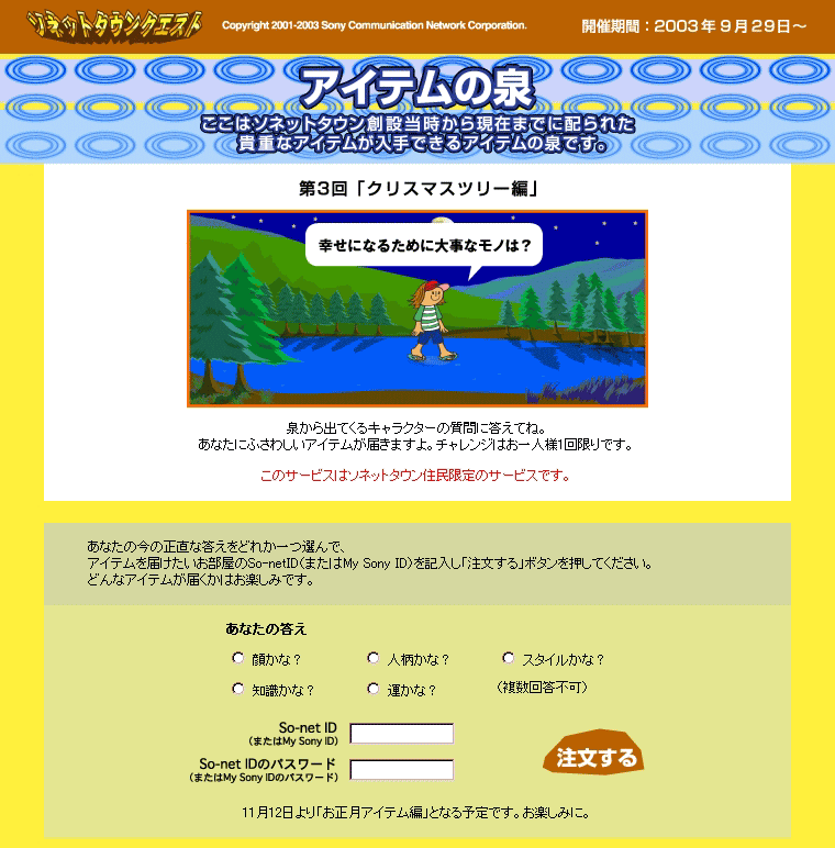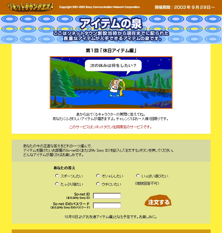 「休日アイテム編」 [2003.09.29~10.10] 泉から出てくるキャラクターの質問に答えると、タウン創設時がらの貴重なアイテムがもらえます。第1回は休日アイテム編です。 問題: 「次の休みは何をしたい?」 答え: スポーツしたい・・・2001年クリスマス ビリヤード台 オシャレしたい・・・2002年サッカーワールドカップ 公式ボール いっぱい遊びたい・・・2002年ソネットタウン1周年記念アニバーサリーショップTシャツ たっぷり寝たい・・・2003年ソネットタウンの四兄弟 ヘビメタ冷蔵庫 ウチにいたい・・・2003年ホワイトデーショコラショップ 夜景 「お友達アイテム編」 [2003.1010~10.24] 問題: 「今のあなたは何気分?」 答え: ウカレ気分・・・2002年暑中見舞い ペンギン ソワソワ気分・・・2002年新会員紹介キャンペーン ウンチョス ワクワク気分・・・2003年バレンタインデーチョコラショップ 新サブチョコ 夢気分・・・「クイズ飼い主は誰ニャ?」 星になったニャータマ メソメソ気分・・・「ボッチを探して」 ボッチポスター |