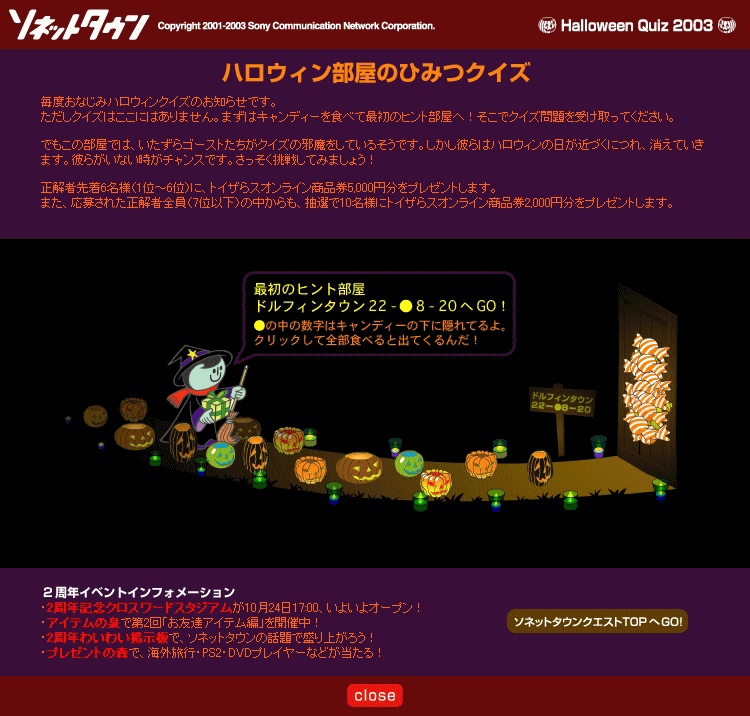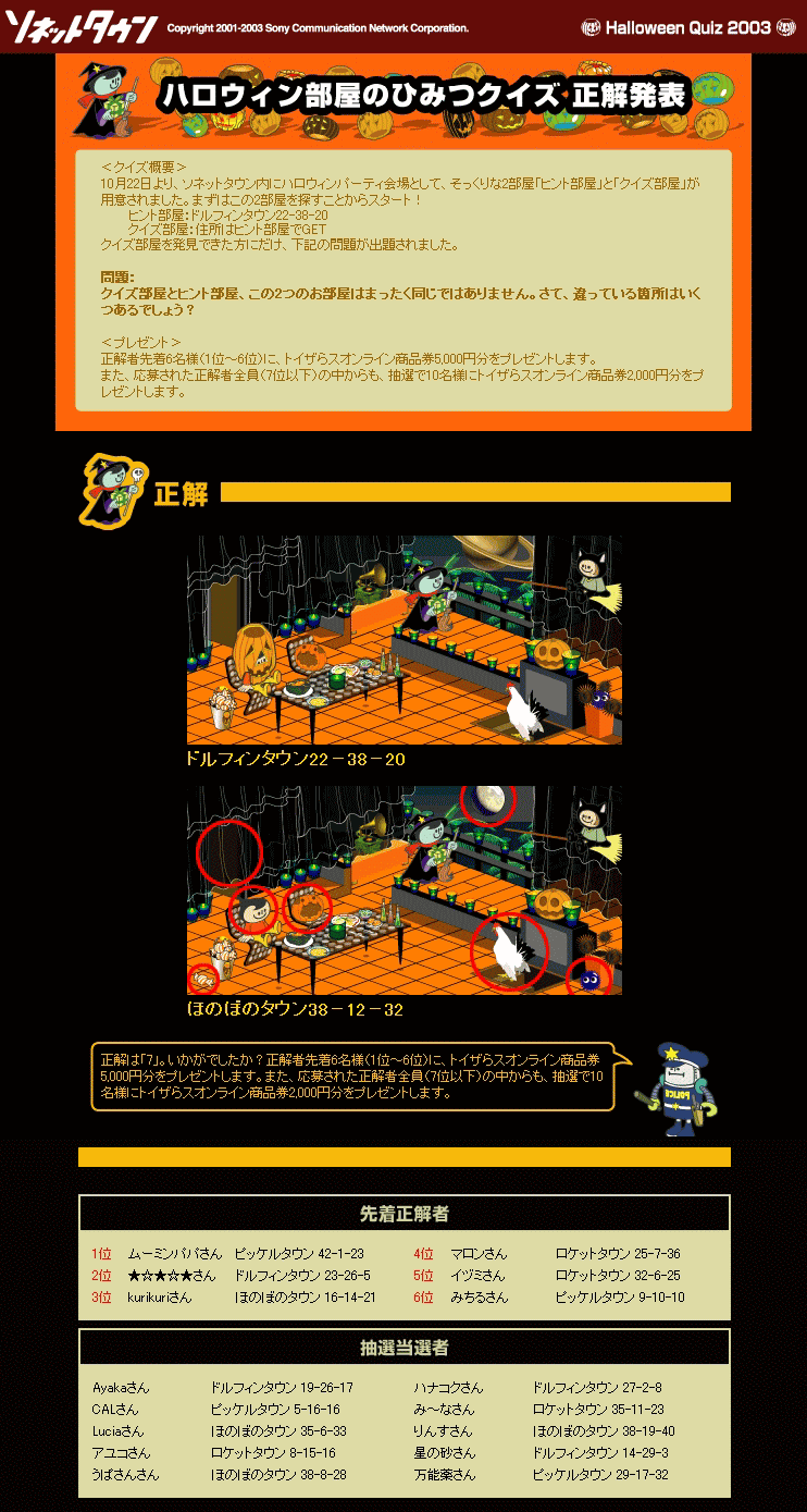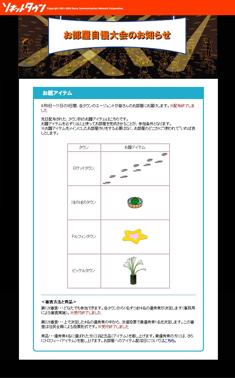 [2003.05.27] 2003年5月8~20日にかけてタウンで開催されたクイズの正解者の中から抽選で50人に「ひみつアイテム」が当たりました。 |