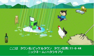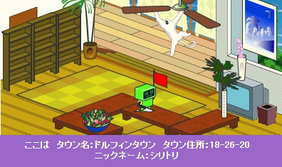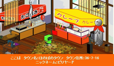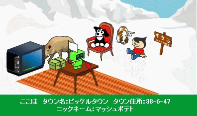 「お正月アイテム編」 [2003.1112~11.30] 泉から出てくるキャラクターの質問に答えると、タウン創設時がらの貴重なアイテムがもらえます。第4回はお正月アイテム編です。 問題: 「お正月、年賀状が1通だけでした。さて、誰から?」 答え: 家族から・・・2002年おせち2段 恋人から・・・2002年琴 友達から・・・2003年宝船 見知らぬ人から・・・2002年和凧 仕事関係の人から・・・2003年賽銭箱 |