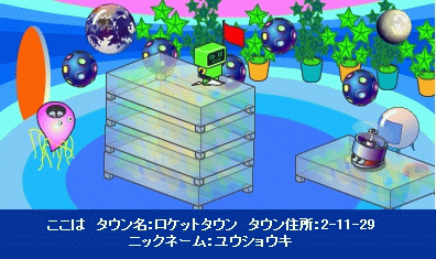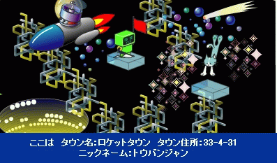 「兄弟たちは家を出て、さっそくそれぞれの街に店をもちました。 はたしてはじめての商売はうまくいくのでありましょうか? ロケットタウン 33-11-4 (長男の店) ほのぼのタウン 30-17-50 (次男の店) ドルフィンタウン 15-11-47 (三男の店) ピッケルタウン 39-10-8 (四男の店) ………つづく」 |