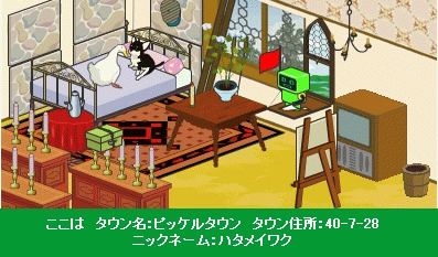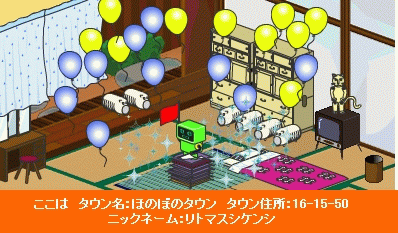 お部屋のプロフィール解説 ★ほのぼのに2匹合わせて52-12-66 (ハタあげ四番発見済み→ほのぼの 16-15-50へ、ハタあげ七番発見済み→ほのぼの 36-7-16へ) |