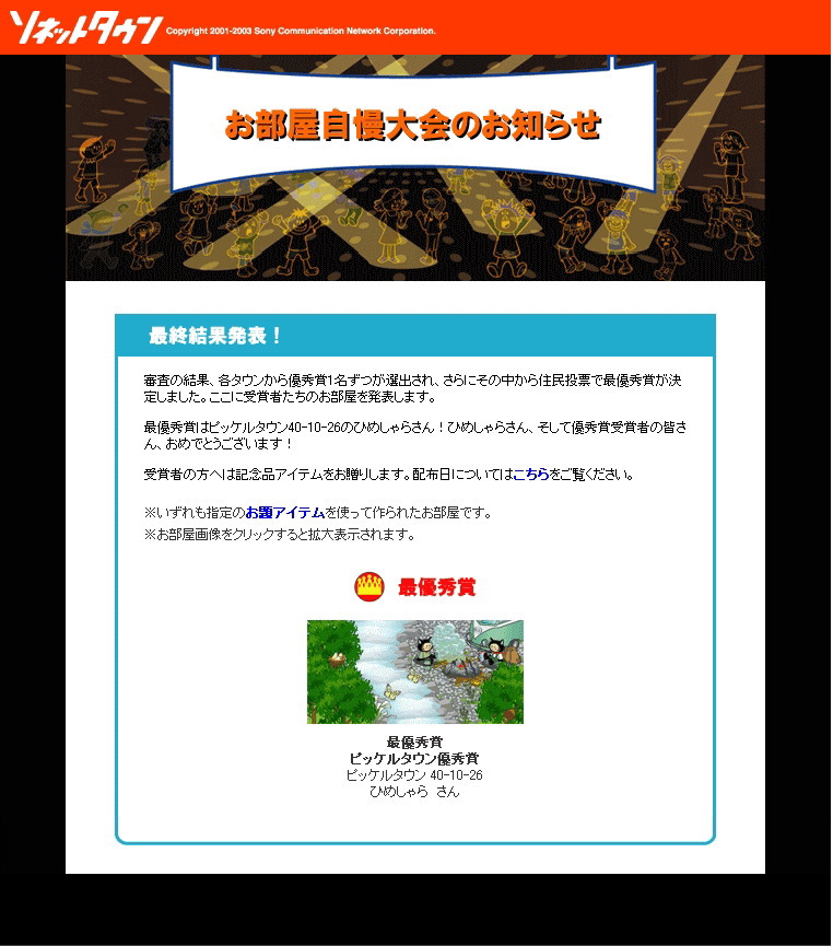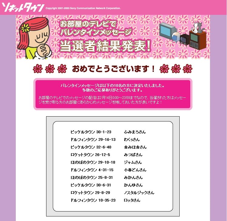 [2003.01.30~2003.02.14] 当選するとメッセージを贈りたいお友達のお部屋にあるテレビからあなたのメッセージが流れるという企画でした。 |