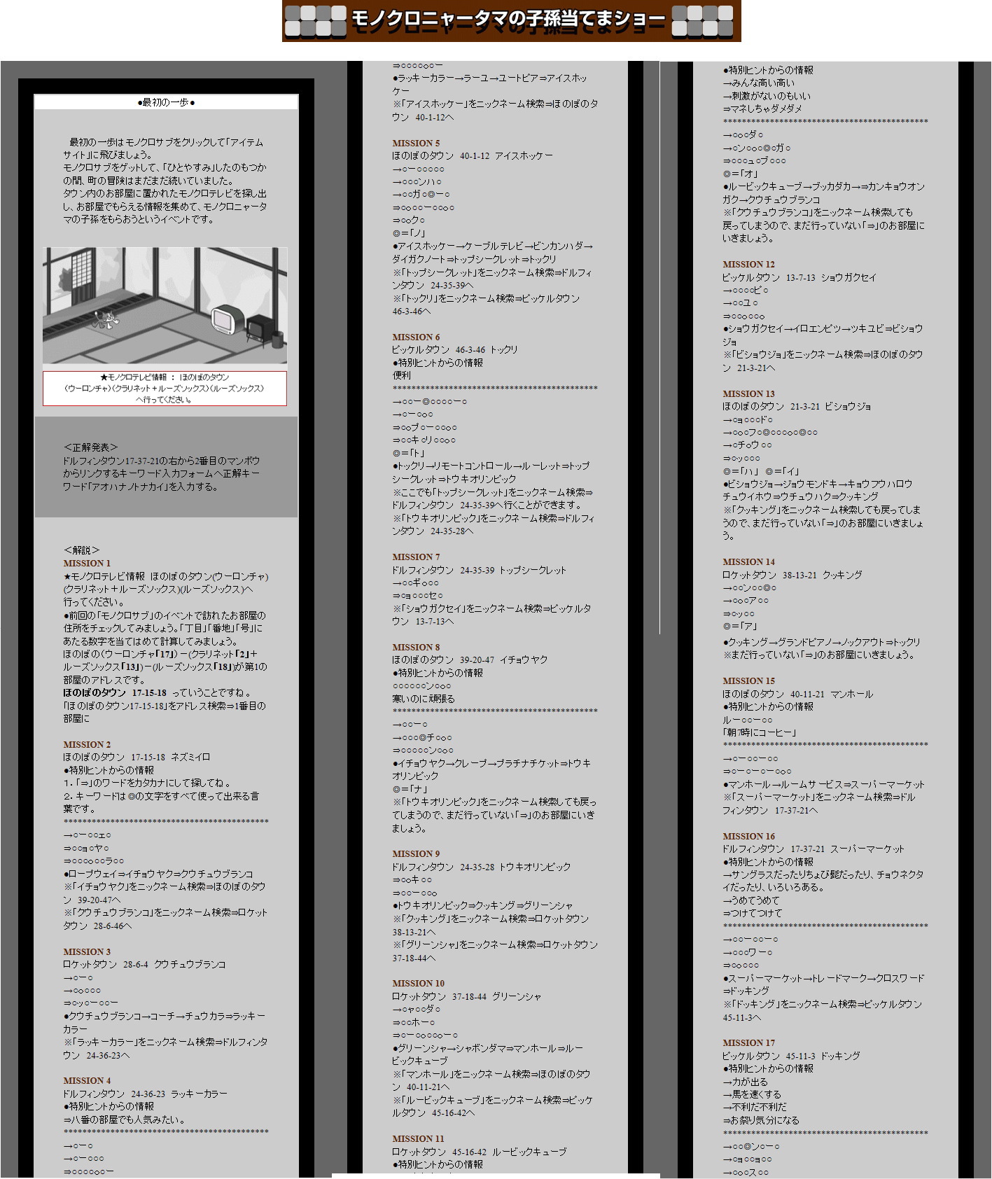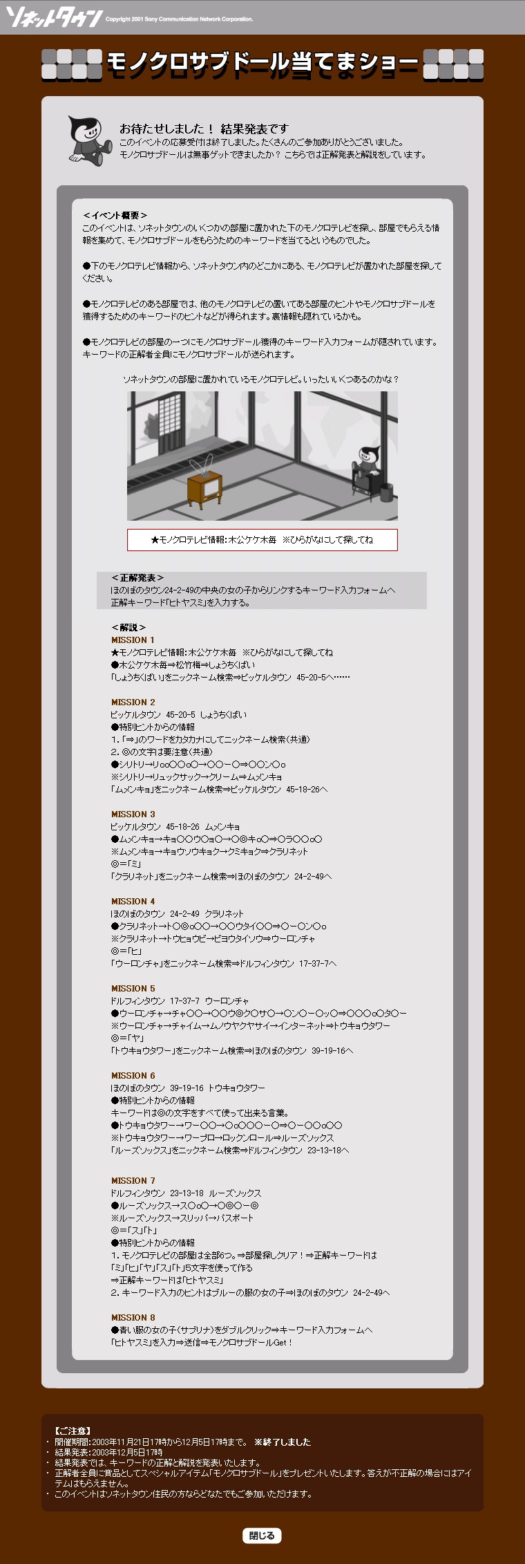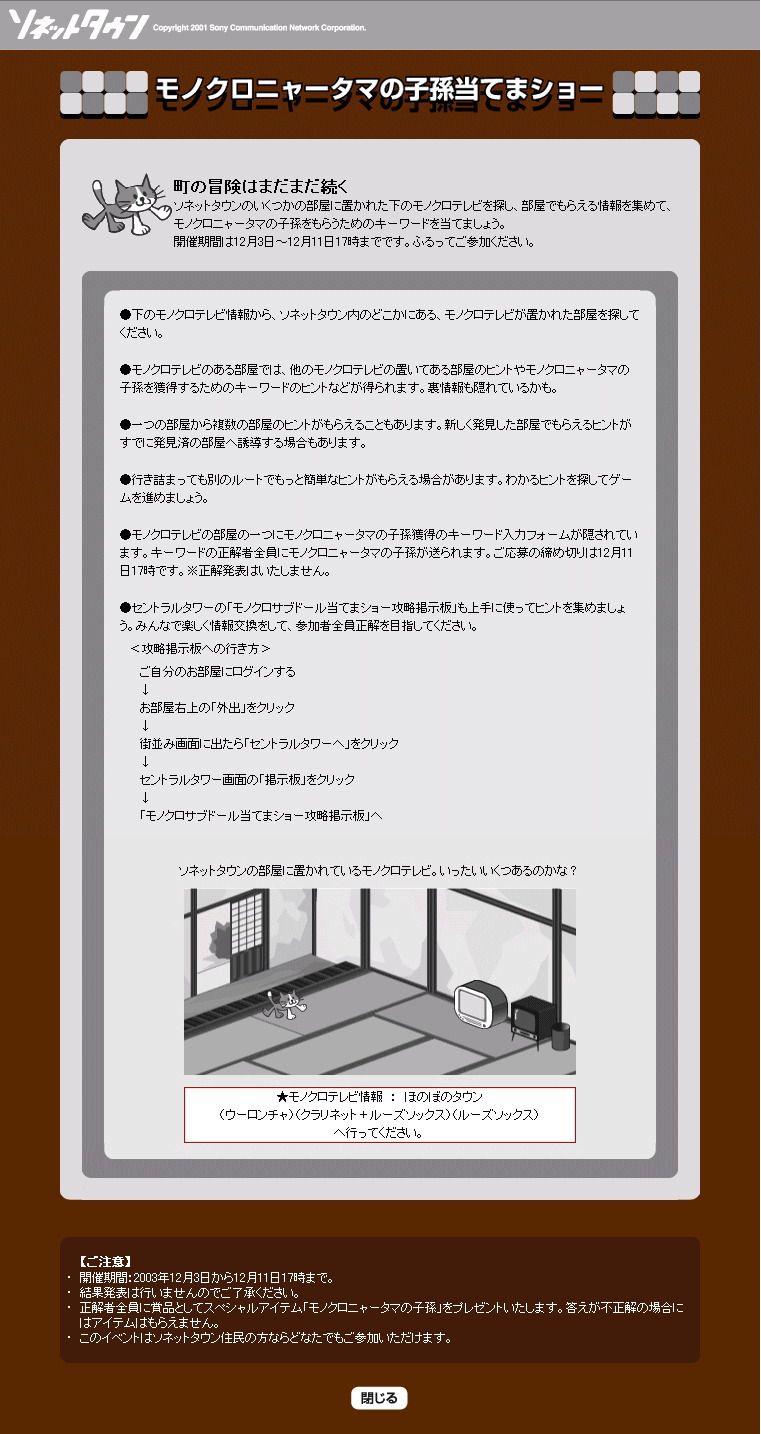 [2003.12.03~12.11] ソネットタウンのいくつかの部屋に置かれたモノクロテレビを探し、部屋でもらえる情報を集めて、モノクロニャータマの子孫をもらうためのキーワードを当てるクイズイベントでした。 |