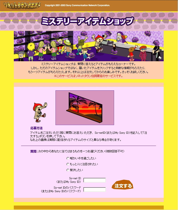 [2003.10.30~2003.11.21] ミステリーアイテムショップは、質問に答えるとアイテムがもらえるコーナーです。 しかし、ただのアイテムショップではなく、届いたアイテムをクリックすると素敵な情報がもらえたり、 もう一つアイテムがもらえたりしました。 |