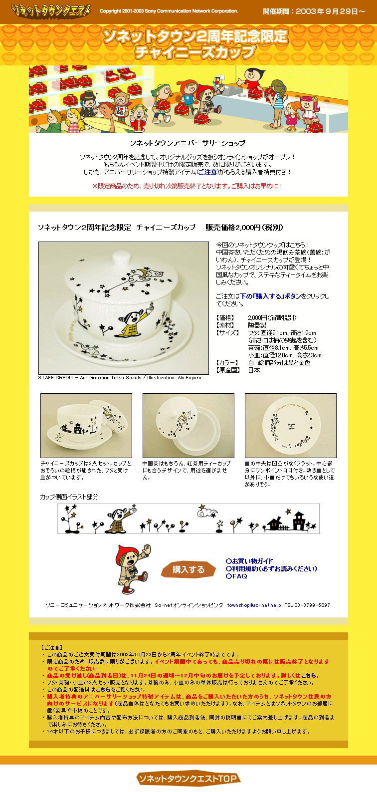 [2003.10.23~10.28] ソネットタウン2周年記念の「アニバーサリーショップ」オープン告知でチャイニーズカップがタウン住人全員に這いづされました。アニバーサリーショップで販売している実際の「チャイニーズカップ」を購入するとスペシャルアイテム「チャイニーズドール」がもらえました。 |