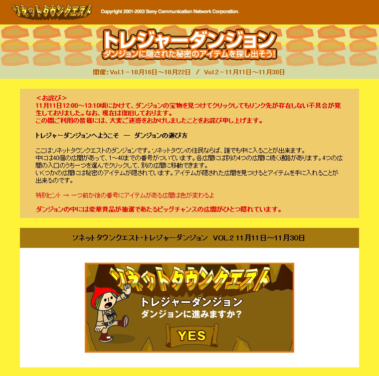 [2003.10.16~10/22] お宝探しイベントの第1弾です。ダンジョンを冒険して宝箱を見つけましょう。 「トレジャーダンジョンVol.2」 [2003.11.11~11/30] お宝探しイベントの第2弾です。ダンジョンを冒険して宝箱を見つけましょう。今回は抽選でビッグな賞品がもらえる宝箱も存在。 |