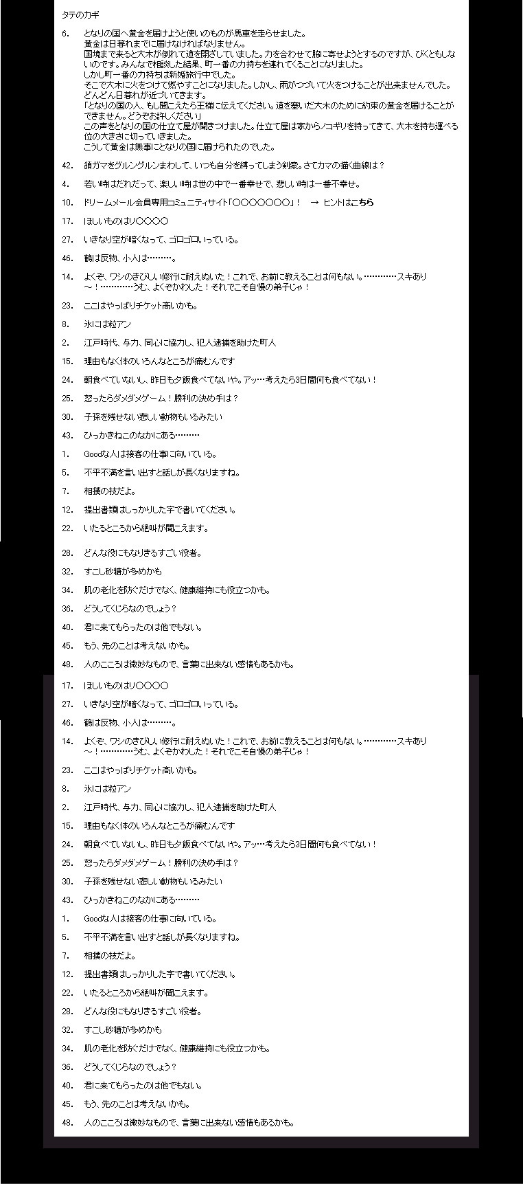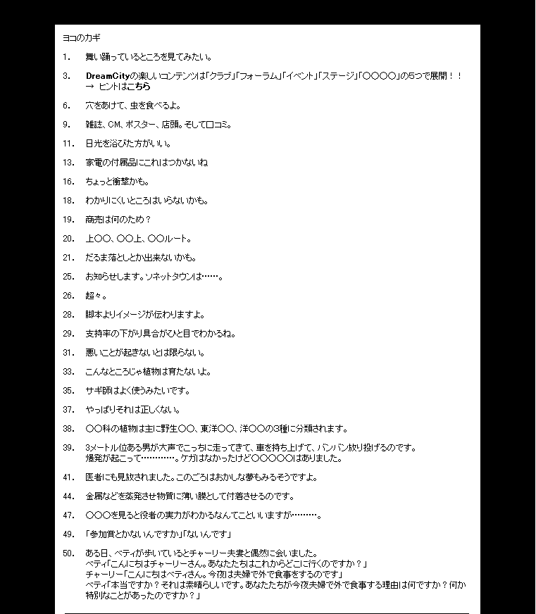 「この時代は歌唱力のある歌手に 必ずしも人気が集まるわけではありませんでした。 表情がかわいいとか、仕草が愛らしいなど、 当人の魅力がうまく伝われば歌唱力がなくても ファンのハートをガッチリつかむことができたのです。 サブリナの歌手として恥じるべき幸運により、 四男は未来の家電の取引に成功しました。 このことが噂になり、サブリナにCDデビューの話も持ち上がったのです。 ※夢の四男ショップのアイテムは品薄のため、 各アイテムにつき20個ずつです。 希望者はパズルに正解して先着順に配布されることになっています。 ………つづく」 |