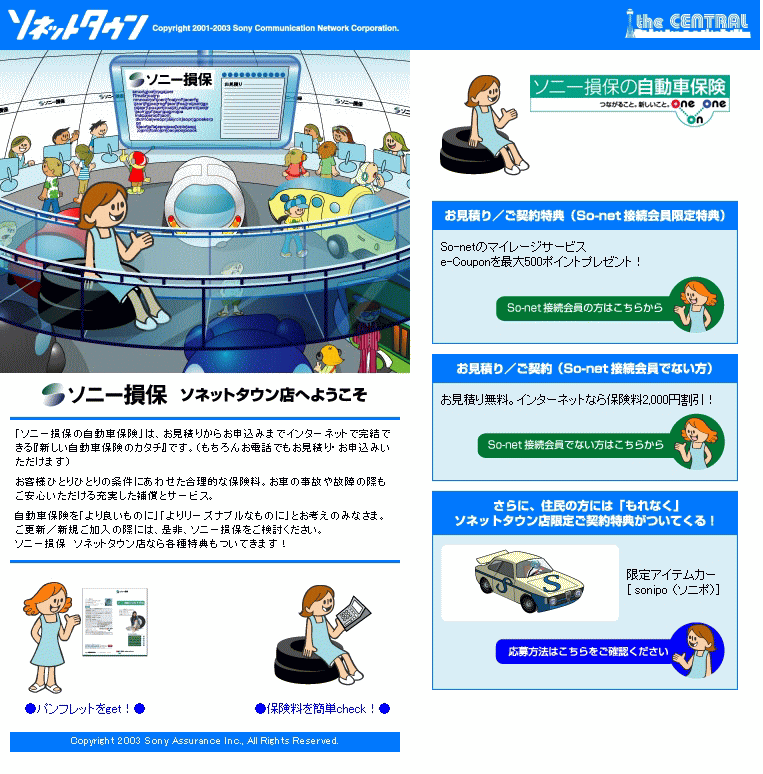 [2003.03.10~] ソニー損保のソネットタウン店で契約するとソニポというスポーツカーがアイテムがもらえるキャンペーンでした。アイテムの他にも割引やクーポン特典がつきました。 |