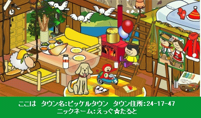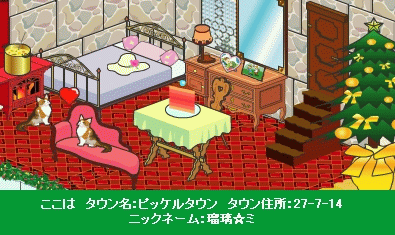 ◆作者のコメント◆ ここは2階にベットのあるピッケルらしい部屋です。暖かい感じにしたかったのでストーブがあります。ここはクリスマスになったらツリーを置きたい部屋です。人生ゲームをスケッチブックのかわりにおいてあります。アイテムが多いので以下に丸太を少なく使うかが難しかったです。 |