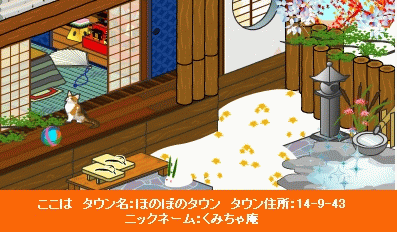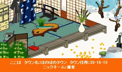 【アイテム総数】46くらい!? 【セールスポイント】 お部屋の状態はほとんど元のままなのですが、今回は「ストーリー性」を 持たせるということに重点を置きました。(ストーリーはマイプロ参照(^_^;) 「刀」をみた瞬間に「時代劇チックな部屋を作りたい」と思い作り始めました。 丁度いいタイミングで「ソニポ」と「ハリネズミ」がきたので、「山吹色の菓子の箱」と「ふろしき包み」も置いてみました。 |