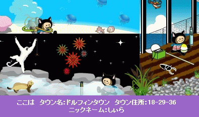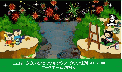 アイテム総数;49個 「水辺の花火大会」 高台の特等席で大輪の花火を見て歓声をあげているブちゃん達。 水面には打ちあがった花火がうっすら見えます。水辺にはたまちゃんもこの花火にうっとり |